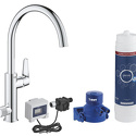 ПрочееСмеситель GROHE Blue Pure BauCurve C (хром) для фильтрованной и водопроводной водыЭлектронный счетчик расхода ресурса фильтрующего элементаФильтр GROHE с 5-ю ступенями очисткиГоловка фильтра GROHE — профессиональная головка фильтра с тремя настройками жесткости водыУдобное крепление на головке фильтра для монтажа на стену или на пол, с быстросъемной системой замены фильтрующего элемента