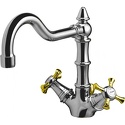 Назначение: для умывальника • Конструкция: с раздельными клапанами • Монтаж: горизонтальный • Клапан: керамический • Материал: покрытие - двухцветный • Подводка: гибкая • Монтажные отверстия: 1 отверстие • Форма излива: традиционная • Душевая лейка в комплекте: нет • Аэратор: есть • Донный клапан в комплекте: есть